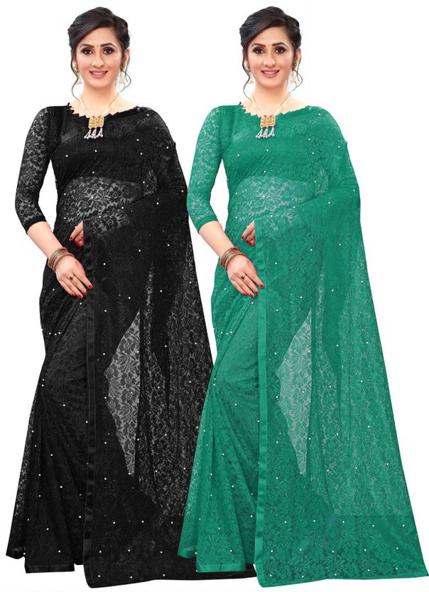 LOROFY Self Design Bollywood Net Saree  (Pack of 2, Dark Green, Black)