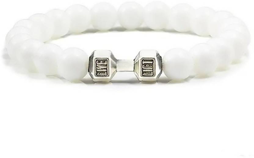 White Beaded Bracelet with Dumbbell Charm - Stylish Gym Accessory for Men & Women