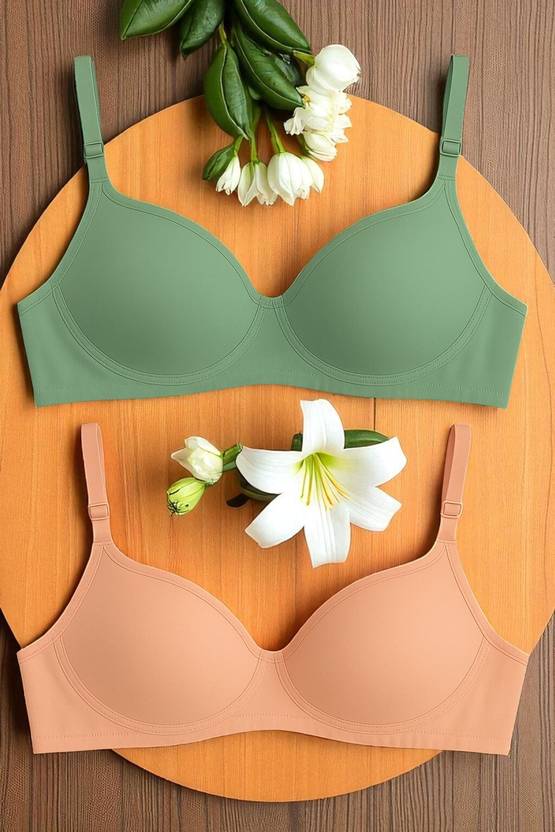 Wiring: Non-Wired (Wirefree), Back Style: Regular Back with Hook-and-Eye Closure, Strap Type: Adjustable Shoulder Straps, Colors: Green & Peach Nude (Pack of 2)