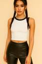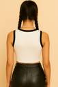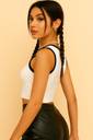 Upgrade your casual wardrobe with this white sleeveless crop top featuring black contrast trim on the neckline and armholes. Crafted from high-quality polyester fabric, it offers a smooth, lightweight, and stretchable feel for all-day comfort. The fitted design enhances your silhouette, while the crew neckline provides a clean, sporty touch.