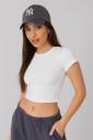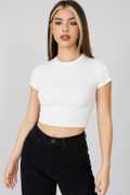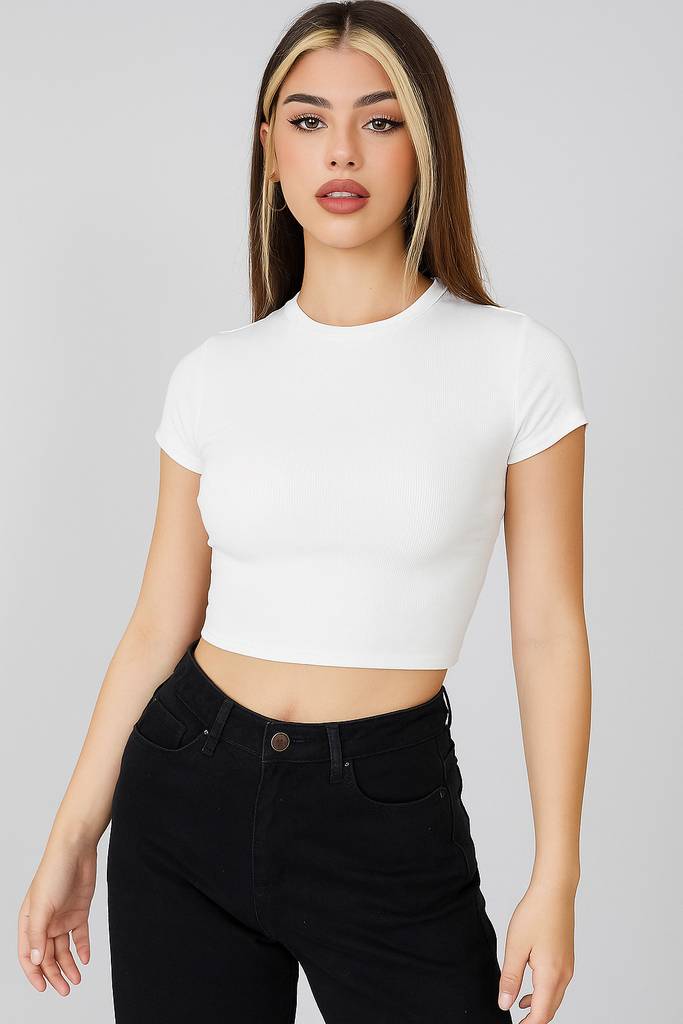 This short-sleeve ribbed crop top is designed for a clean, minimal look with everyday wearability. Made with a stretchy polyester blend, it provides a flattering, body-hugging fit while maintaining comfort and movement. The classic crew neckline and solid white color make it easy to pair with jeans, skirts, joggers, and layers. Perfect for casual styling, streetwear, or a polished basic wardrobe.