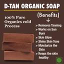 D-Tan soap helps detoxify your skin, remove a tan, and lighten your skin tone. Manjistha roots, Licorice help skin lightening, brightening. Licorice helps to reverse hyperpigmentation, a condition where the skin forms dark patches or spots on the skin that makes it look uneven in tone and texture. Anti-inflammatory property that work wonders in countering layered tanning Rose Extract helps with its vitamins, antioxidants, and minerals and its oil are fantastic for tackling dry skin.