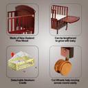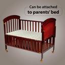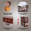 LuvLap Cot C- 80 includes a cozy detachable new-born cradle which helps baby fall asleep easily by its manual swinging motion.The cot C80 is made of new Zealand pinewood finished poslish which makes it more classic, it Includes detachable quality mosquito net for both bassinet and cot, to safeguard baby from bug bites. Cot base has 3 adjustable heights and front railing can be opened to lengthen the cot, allowing the cot to grow with baby, Side railing can be opened to conveniently attach to parent bed, it has Has huge stocking space underneath the base, to stock essential baby items, Cot can be converted into a study desk once the child outgrows it. Recommended age - 0 - 24 Months & weight up to 15 Kgs