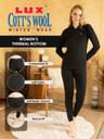 Lux Cottswool Women's Black Thermal Trouser.A body hugging thermal weat for icy days and chili nights.Made from exceptional soft cotton,processed to draw moisture away.Designed to be worn as undershirt and underpants.Front open botton for extra comfort.