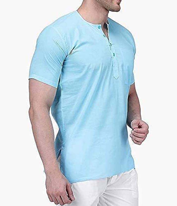 Men Solid Cotton Blend A-line Kurta (Light Blue)