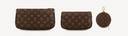 The Multi Pochette Accessoires is a hybrid cross-body bag with multiple pockets and compartments that brings together a Pochette Accessoires, a Mini Pochette Accessoires and a Round Coin Purse. Fashioned from Monogram canvas with a mini Monogram pattern on the sides of the two pochettes, it has both a removable gold-tone chain and an adjustable Louis Vuitton inscribed Jacquard strap for multiple carrying options.