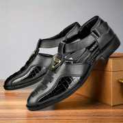 These black sandals feature a closed-toe design with perforated details on the vamp, complemented by a textured, possibly faux-croc, panel. The T-strap design includes an adjustable buckle closure around the ankle for a secure fit. The flat, textured sole provides comfort and grip. These versatile sandals are suitable for various casual occasions. Compatible products include: jeans, chinos, shorts, casual trousers, kurtas, pajamas, and casual shirts.