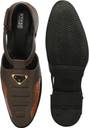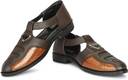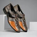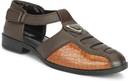 These black sandals feature a closed-toe design with perforated details on the vamp, complemented by a textured, possibly faux-croc, panel. The T-strap design includes an adjustable buckle closure around the ankle for a secure fit. The flat, textured sole provides comfort and grip. These versatile sandals are suitable for various casual occasions. Compatible products include: jeans, chinos, shorts, casual trousers, kurtas, pajamas, and casual shirts.