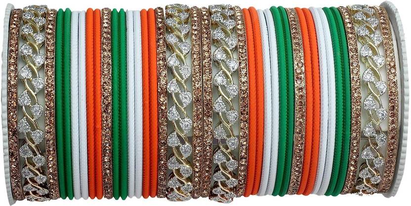 American Diamond Kade With Orange, White & Green Colour Plane Matte Design Metal Bangles Set For Wearing On The Occasion Of Independence Day & Republic Day Or Any Other National Event For Women & Girls (Pack Of 2 Hands). Flag Bangles ;; tricolor bangles ;; republic day bangles ;; independence day bangles ;; tricolour bangles ;; Republic Day Ki Chudiya ;; independence day ki chudiya ;; deshbhakti ki chudiya ;; jhande ke color ki chudiya ;; flag color bangles ;; orange colour bangles ;; white colour bangles ;; green colour bangles