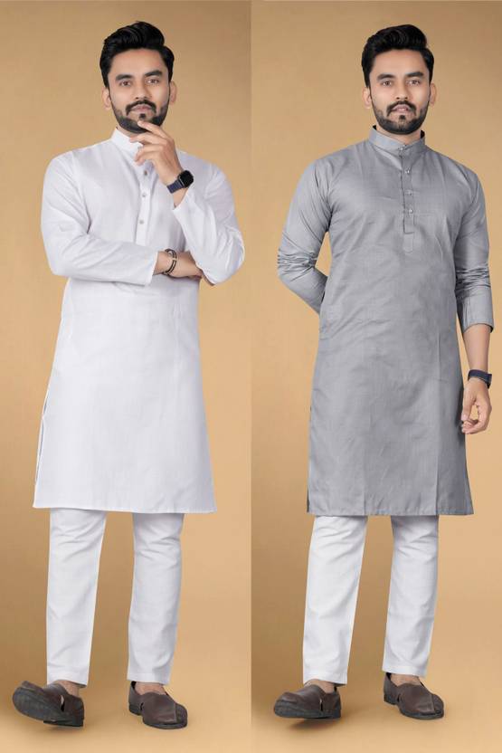LYPLO Pack of 2 Men Solid Cotton Blend Straight Kurta (White, Grey)