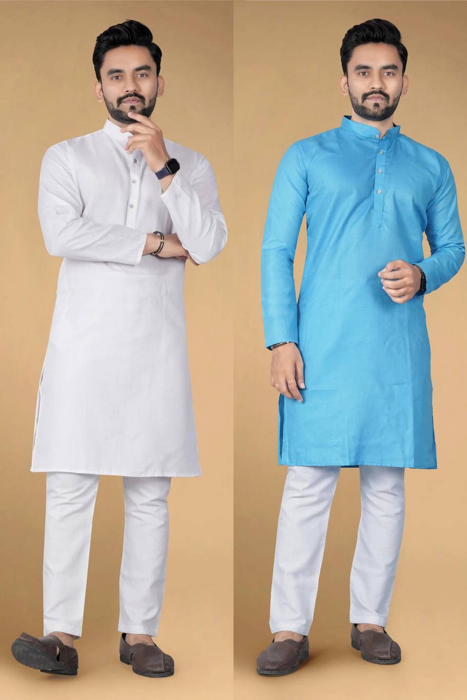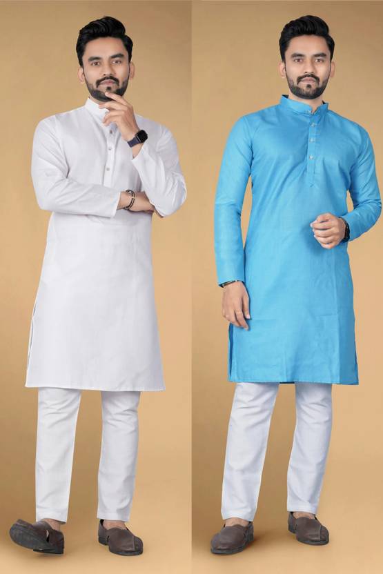 Pack of 2 Men Solid Cotton Blend Straight Kurta (White, Light Blue)