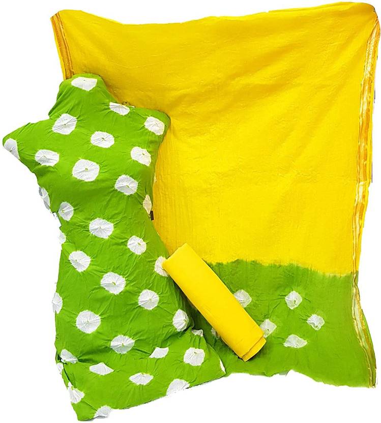 This Bandhani Dress Material Is Cotton Fabric and Original Handmade Tie and dye Design By Awarded Craftmen Of Rajasthan. 3 pieces Sets Of Top, Bottom and Dupatta. In Proper Size (Top): 2.50 meter, (Bottom): 2.25 meter and (Dupatta): 2.25 meter. This Is Free size Dress Material Can Be Make Any Size and any Design. Salwar Can Be Make Cudidaar, Pants, Plazzo etc. All Over Same Color Of Top and Bottom and Dupatta. This Is Bandhej Dress Material Is Make First Time Roll Press Then Become In Proper Size. Washing Instruction: Saperate Wash/Dry In Shades/Drywash Recommended.