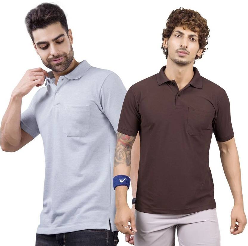m2hit Solid Men Polo Neck Grey, Brown T-Shirt