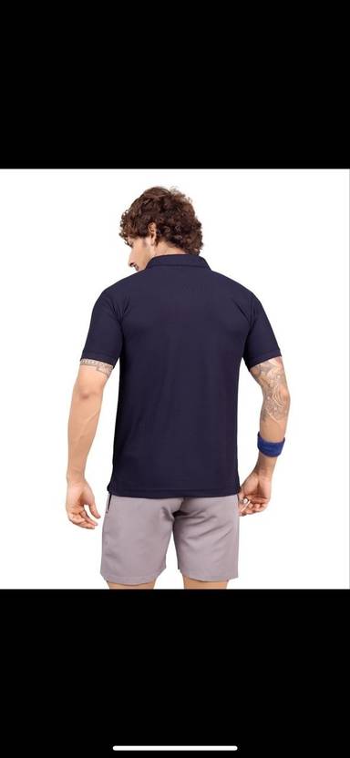 m2hit Men Solid Polo Neck Cotton Blend Navy Blue T-Shirt