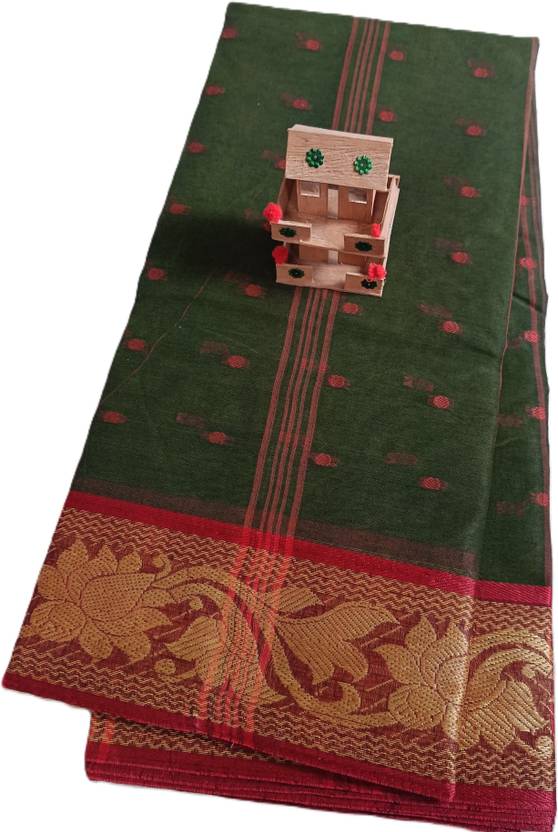 Maasaree Printed Tant Pure Cotton Saree (Dark Green)