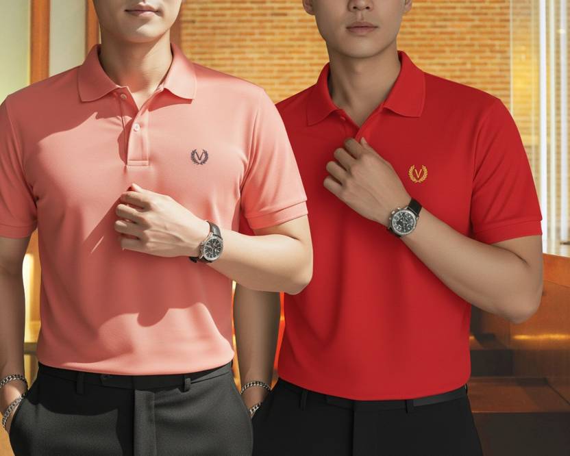 Pack of 2 Men Solid Polo Neck Cotton Blend Pink, Red T-Shirt