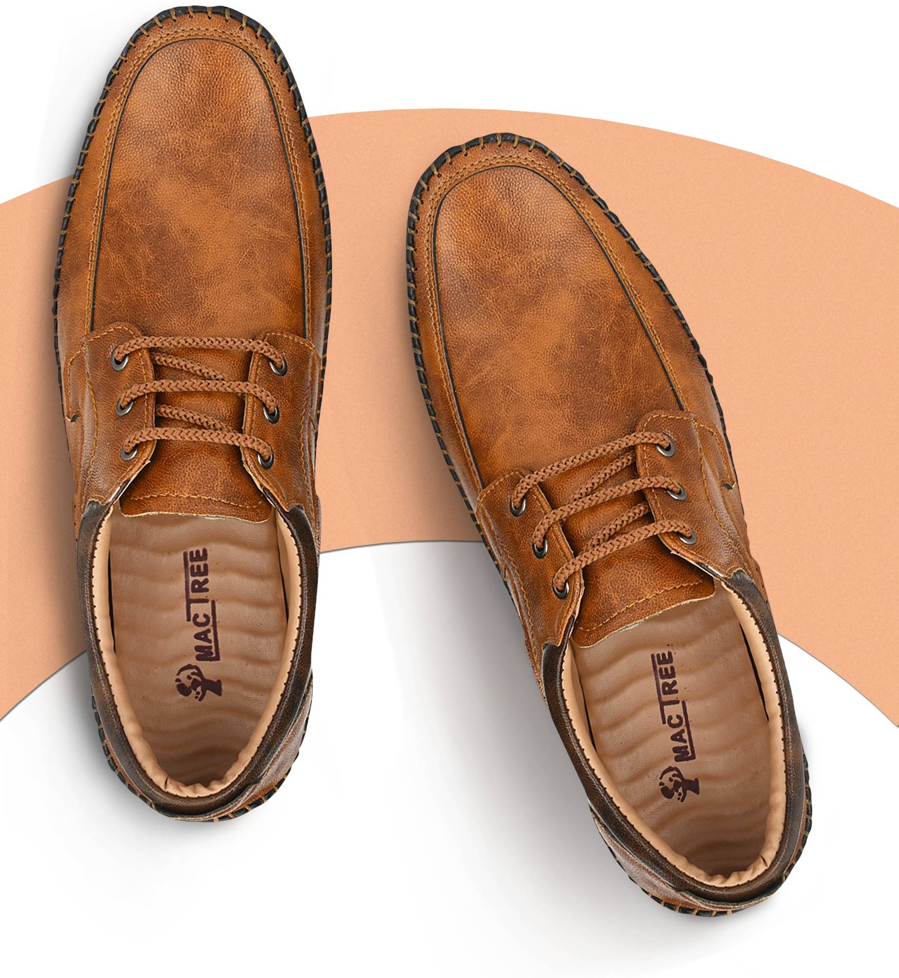 A pair of Tan Formal Shoes,has regular styling. Lace Up detail for firm grip. PU upper. Stiched Flexible sole for extended durability and comfort.Cushioned Footbed