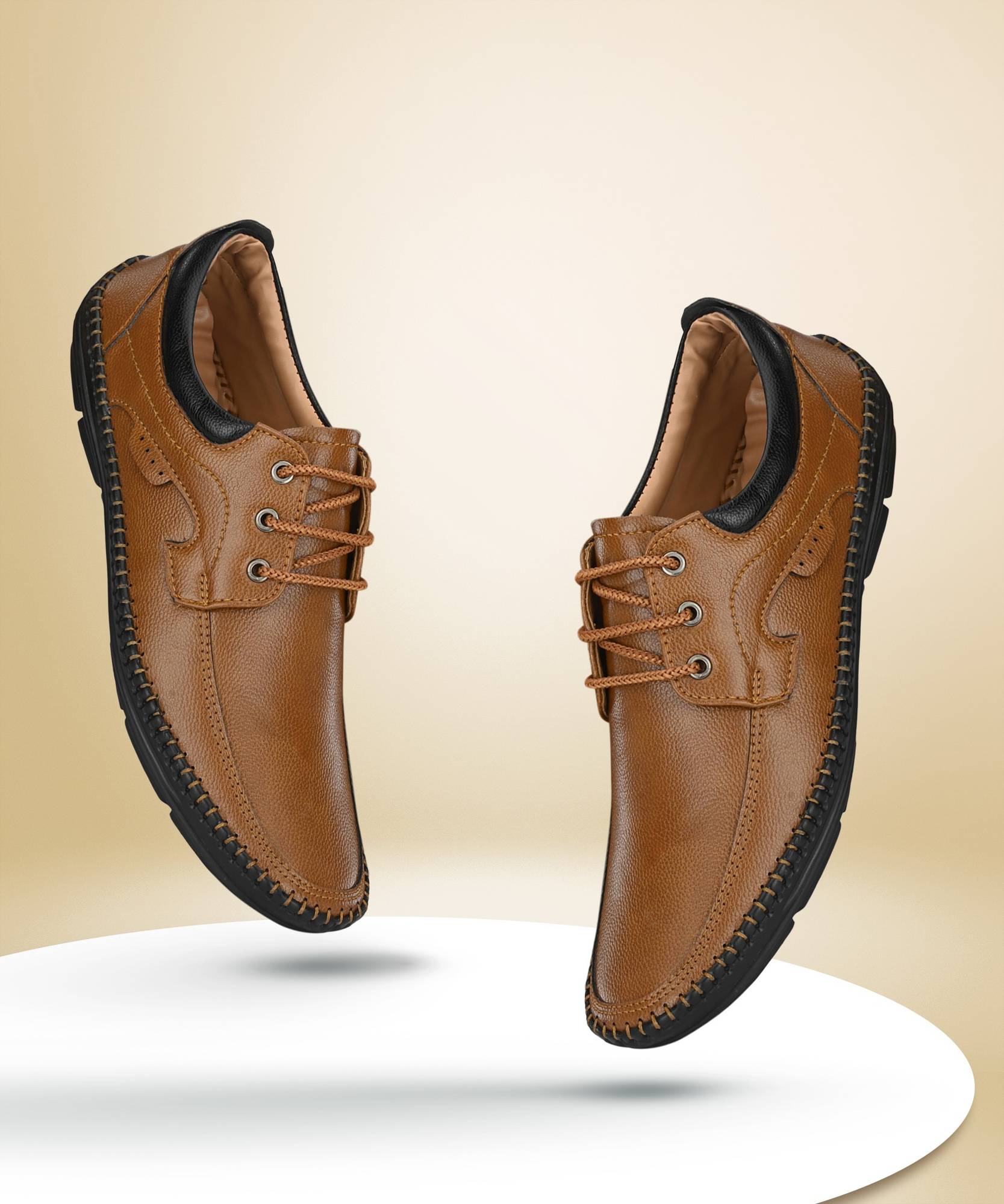 A pair of Tan Formal Shoes,has regular styling. Lace Up detail for firm grip. PU upper. Stiched Flexible sole for extended durability and comfort.Cushioned Footbed