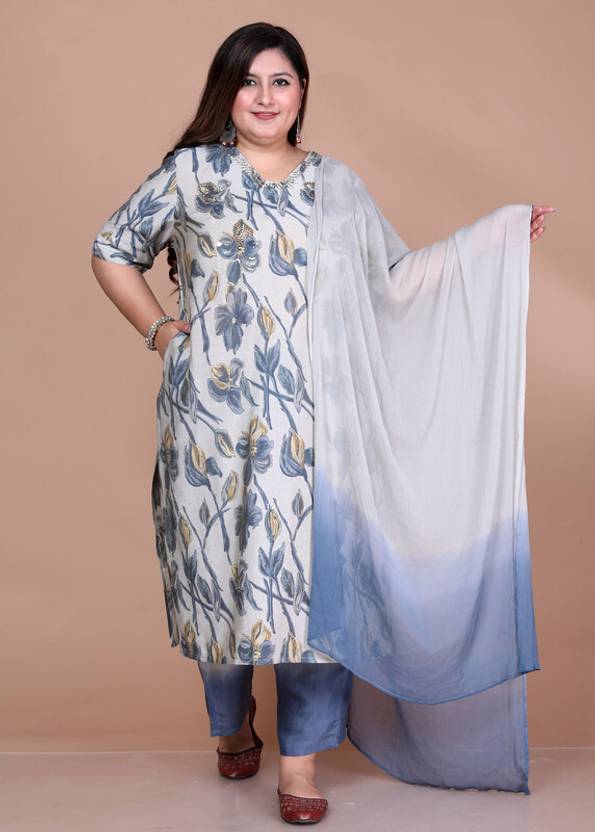 Muslin Foil Print 3 Pc Suit Set with Hand work for plus size women's