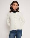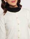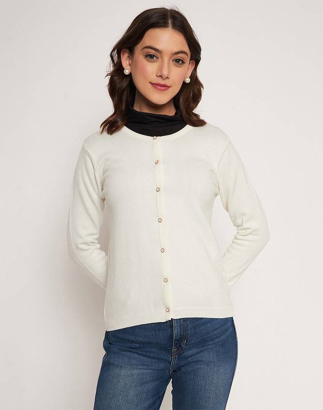 Introducing the classic Madame Off White Solid Cardigan, which has a traditional round neck shape and will be a versatile addition to your wardrobe. This cardigan is made of high-quality cloth and is both stylish and comfortable. Its basic off white color makes it easily adaptable to a variety of outfits, whether layered over a casual ensemble or combined with a more formal look.