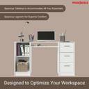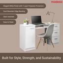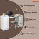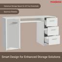 The Madesa Alaska Desk is a cozy and ideal option to upgrade your office or home workspace. It features a wooden tabletop, three spacious drawers with metal slides, and a shelf below the tabletop with an opening at the back. Additionally, it includes a door with metal hinges and internal storage space for organizing items. It accommodates everything in an organized way: computer, lamp, books, notebooks, folders, and anything you need for your study or work area. The external finish is white. The process is done with high-resistance Polyester Paint, providing enhanced protection to the furniture and being environmentally friendly due to its eco-friendly nature. Total furniture dimensions: 77 cm in height, 136 cm in width, and 45 cm in depth. (Images for illustrative purposes only. Chair and decorative items not included.) Included items: One (1) desk with three (3) drawers, one (1) door, one (1) shelf, a tabletop made of MDP, and PVC handles. Note: The product is delivered disassembled and will be assembled by the service partner. It includes an installation manual and all necessary hardware for assembly.