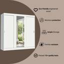 The Reno Couple's Wardrobe from Madesa strikes the ideal balance between a modern design, excellent internal organisation, and high-quality materials. It features three sliding doors equipped with aluminium tracks for a smooth, effortless glide, efficiently conserving bedroom space without impeding access. Notably, two of these doors incorporate mirrors, enhancing the room's openness and proving to be extremely practical for daily use. The wardrobe also offers four spacious drawers with metallic slides, two rods for long clothing, and one for shorter items, ensuring there's ample space for everything a couple might need, including luggage, shoes, pillows, and blankets. The white finish is achieved through a high-resistance Polyester Paint, an eco-friendly approach that ensures the product's longevity. The wardrobe's dimensions are 205 cm in height, 180 cm in width, and 54 cm in depth, designed to meet a wide array of storage needs. While images are provided for illustrative purposes only, the wardrobe includes eight (8) internal niches, four (4) internal drawers, three (3) hanging rods, and three (3) sliding doors, one made of wood and two featuring mirrors and PVC handles, making it a durable, stylish, and functional choice for couples . Note: The product is delivered disassembled and will be assembled by the service partner. It includes an installation manual and all necessary hardware for assembly.