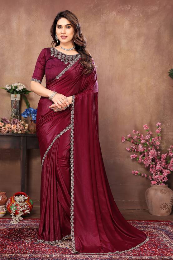 Solid/Plain, Embellished, Embroidered Bollywood Net Saree (Maroon)
