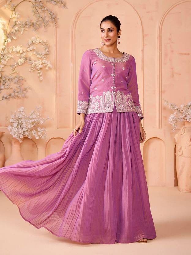 BEST OF COMFORT AND STYLE: Made from a Short Kurta Top And Skirt Cassata Silk material Solid With Embroidery Dori Work And a New Style Round Neck Front-Slit 2 Piece Skirt With Short Kurti Top Style Short Top Set. This Skirt With Kurti Top Style for women is designed to comfort all day long. The fabric helps you keep cool and dry during summer.