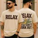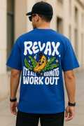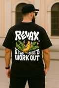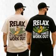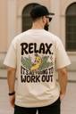 A stylish, oversized cream-colored t-shirt featuring a bold and playful design. The front of the t-shirt displays the word "RELAX" in large, bubbly black letters, exuding a chill and laid-back vibe. On the back, the same "RELAX" text is paired with a cheerful, cartoon-style banana character lounging against large green leaves with both thumbs up. Below the illustration is an uplifting message that reads: "IT'S ALL GOING TO WORK OUT", reinforcing a positive and carefree attitude. The t-shirt combines comfort, humor, and motivation, making it perfect for casual, streetwear-inspired outfits.
