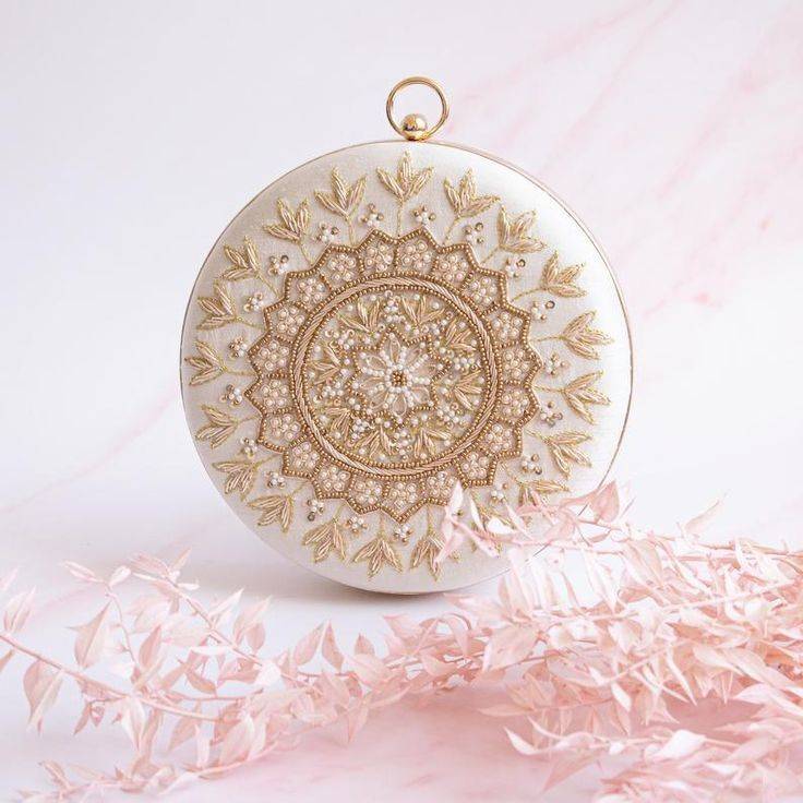 elegant round clutch features a rich maroon base adorned with intricate golden embroidery, creating a stunning traditional design. Crafted with premium detailing, it measures 19 cm in height and width, making it a perfect compact accessory for weddings, parties, and festive occasions. The golden chain adds a classy touch, allowing it to be carried comfortably as a sling or handbag. Stylish, lightweight, and beautifully designed—this clutch enhances any ethnic or Indo-western outfit.