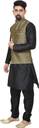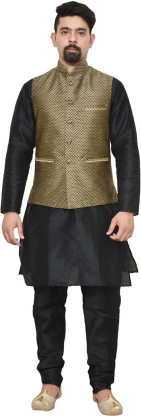 Men's Black Matching Silk Kurta Churidhar With Black Bindoo Waistcoat