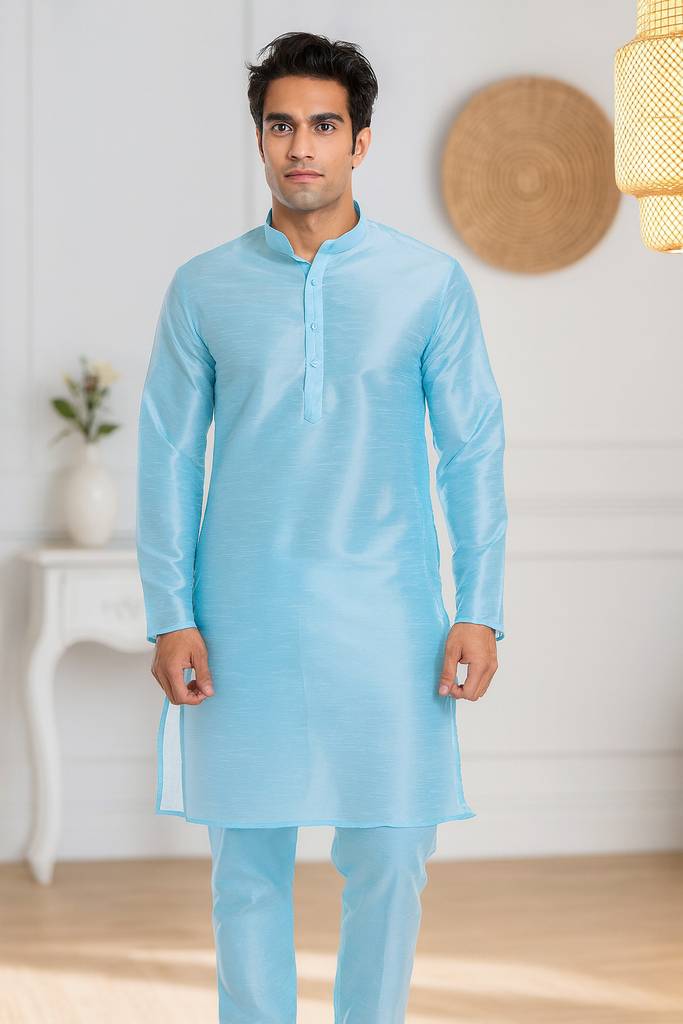 This amazing party/traditional wear Kurta has full-sleeves and button-down neckline that lends you the look of a debonair Indian men.