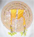 The shining of Lord Laddu gopal is like pearl and diamond that’s why there dress should be sparkling like him. Here we come with this special Yellow dress. This beautiful dress is made with tissue stuff and decorated with white pearl and sparkling stones. Lines of while pearl and stones comes after another one by one ecrease the grace and beauty of this dress. Pearls encreas the shining of stones and stones enhance the grace of pearl. As we know pearl is a symbol of “peace” and this time we are going to celebrate “Vasant Panchmi”. This is a great occaision to make ready your Laddu Gopal with this peacefull, gracefull, beautiful and soulfull dress.