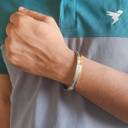 Designed with a hidden clasp mechanism, this kada offers ease of use. The closing method involves a gentle squeeze, allowing it to fasten snugly around the wrist without needing external assistance. Furthermore, this user-friendly feature ensures a neat fit while keeping the overall design uninterrupted. Thus, the closure remains discreet, maintaining a streamlined profile, whether worn alone or alongside other jewellery.