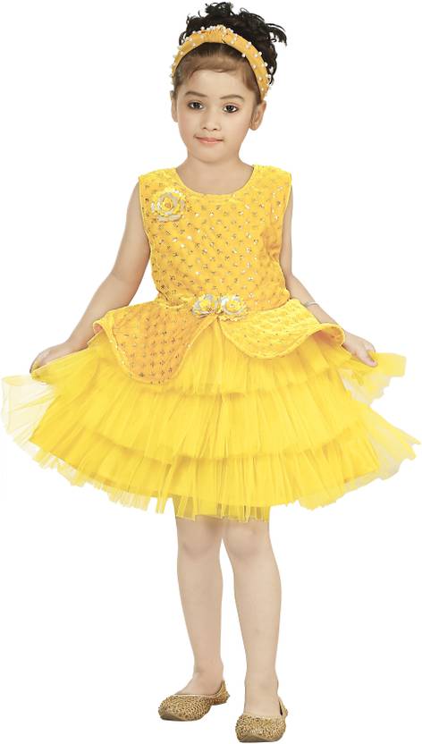 Mahzabin Dress Girls Midi/Knee Length Festive/Wedding Dress (Yellow, Sleeveless)