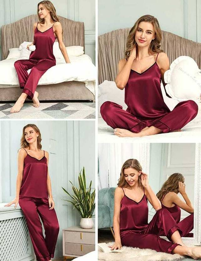 Mixopia Women Solid Maroon Top & Pyjama Set