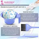 The Majestique Professional 5 Pieces Premium Hair Dye Kit (Blue) is the ultimate all-in-one solution for anyone looking to achieve salon-quality results from the comfort of their own home. Whether you're dyeing, bleaching, or touching up your hair color, this carefully curated kit includes everything you need to ensure a smooth, professional-grade hair coloring experience. Hair Dye Brush: This high-quality brush is designed to provide smooth, even application of hair dye, ensuring full coverage from root to tip. The comfortable handle and soft bristles help you achieve precise, streak-free results without the mess. Tail Comb: A must-have for sectioning your hair, this tail comb makes it easy to divide your hair into manageable sections, ensuring an even application of color. It also helps you detangle hair before dyeing, reducing tangles and breakage. Shower Cap: This cap helps to create a warm, sealed environment for your hair, which accelerates the dyeing process and ensures the color adheres properly. It keeps your hair in place and prevents color from dripping onto your skin or clothes, making cleanup easier. Measuring Handle Bowl (200 Ml): The included mixing bowl makes it simple to prepare your dye and developer in the perfect ratio. The handle makes it easy to hold and maneuver, and the 200ml capacity allows you to mix enough product for your hair length, while also being compact and easy to store. Pair of Gloves: Protect your hands during the coloring process with these durable, comfortable gloves. They ensure you can apply color without worrying about staining or irritation, keeping your hands clean and safe throughout the entire procedure.