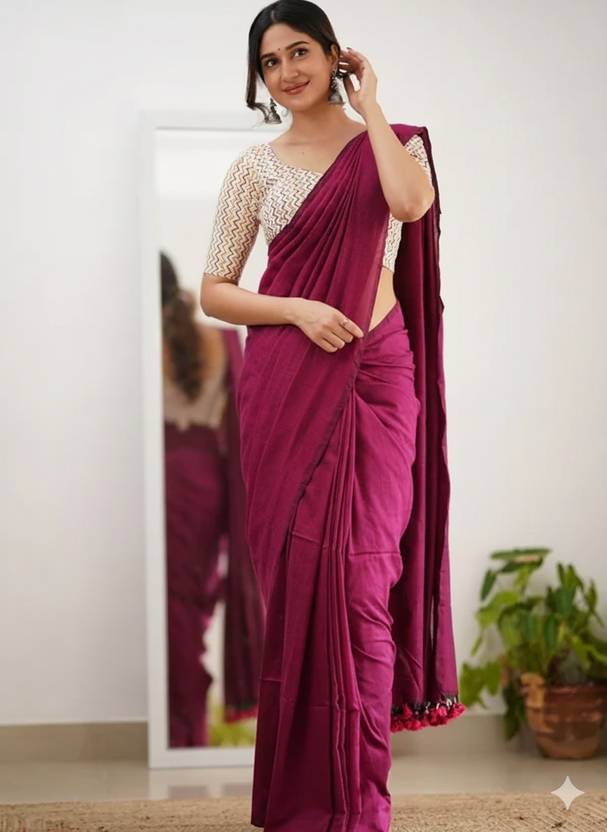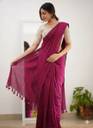 Thanks to its refined solid pattern, this women’s saree offers an elegant aesthetic. Showcasing tassel detailing along the borders, it brings graceful movement to each step while adding a hint of traditional artistry. Thus, the understated charm of this saree supports effortless styling for simple and expressive looks.
