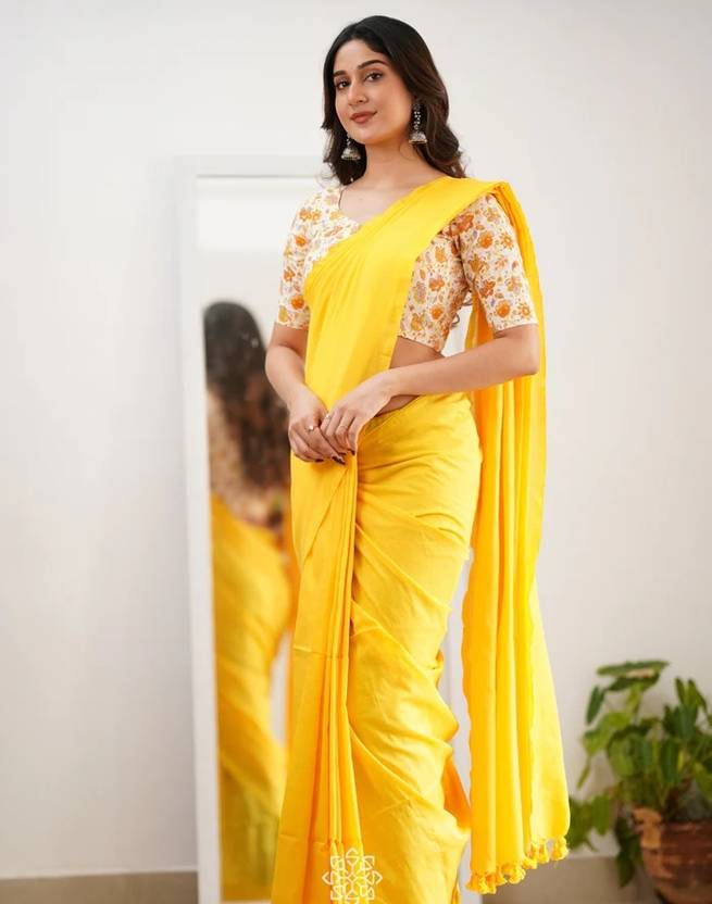Maku Solid/Plain Handloom Pure Cotton Saree (Yellow)