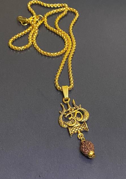 Jewellery Men's and Women's Agate Golden Gold-Plated Brass, Wood Lord Shiv Trishul Locket with Panchmukhi Rudraksha CHAIN