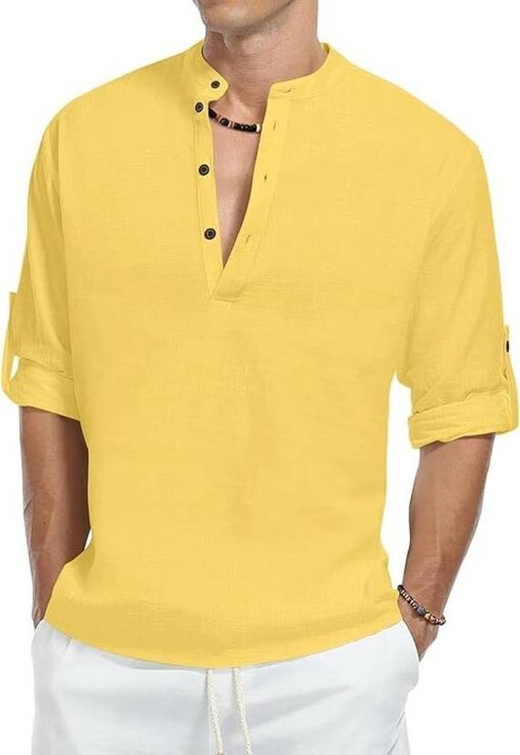 Men Solid Cotton Blend Straight Kurta (Yellow)