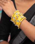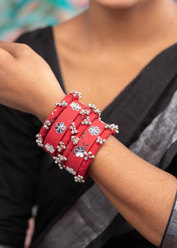 This Handmade Fabric Bangles Set for Women and Girls is the perfect accessory to add a pop of color and charm to any outfit. Made with love and care, each bangle is crafted from high-quality fabric, featuring unique patterns and vibrant hues that make them stand out. They’re lightweight and comfortable, designed to fit a variety of wrist sizes. Whether you're dressing up for a special occasion or adding a fun touch to your everyday look, these bangles are the perfect choice. A great gift for any woman or girl, this set adds a beautiful, handmade touch to any collection of jewelry.