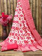 A Jamdani cotton white and red saree would be a stunning piece of traditional attire. Typically, Jamdani sarees are known for their intricate weaving patterns and delicate designs, often featuring floral motifs, geometric shapes, or traditional cultural symbols., The combination of white and red in such a saree could be visually striking. White usually symbolizes purity and elegance, while red is often associated with vitality, passion, and auspiciousness in many South Asian cultures. Together, they create a classic color palette that is both timeless and vibrant., The intricate Jamdani weaving technique would likely be used to create elaborate patterns and motifs in both white and red threads, adding depth and texture to the saree. The red accents could be used to highlight specific elements of the design or to create contrast against the white background.