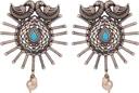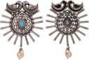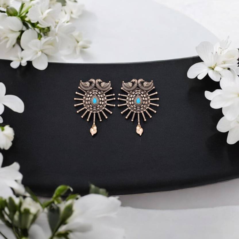 Add a touch of heritage charm to your jewelry collection with our Lovebirds Sunburst Antique Earrings. These statement earrings feature intricately designed twin lovebirds perched atop a radiant sunburst pattern. At the center lies a delicate teardrop-shaped turquoise stone, symbolizing serenity and strength. A dainty pearl droearrings jhumkap adds a touch of elegance, enhancing the vintage appeal.
