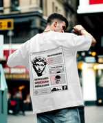 This The man wearing this yellow t-shirt with a newspaper on it exudes a cool and trendy vibe. The oversized fit of the t-shirt provides a relaxed and comfortable feel, allowing you to move freely throughout the day. Whether you're heading out for a casual day with friends or running errands around town, this t-shirt is a versatile choice that can be dressed up or down depending on the occasion.oversize backprint t-shirt is the perfect addition to your casual wardrobe. Made from soft and comfortable fabric, it features a vibrant yellow color that will surely make you stand out from the crowd. The t-shirt is designed with a unique twist - a newspaper print on the back. This eye-catching design adds a touch of creativity and personality to your outfit, making it a great conversation starter.