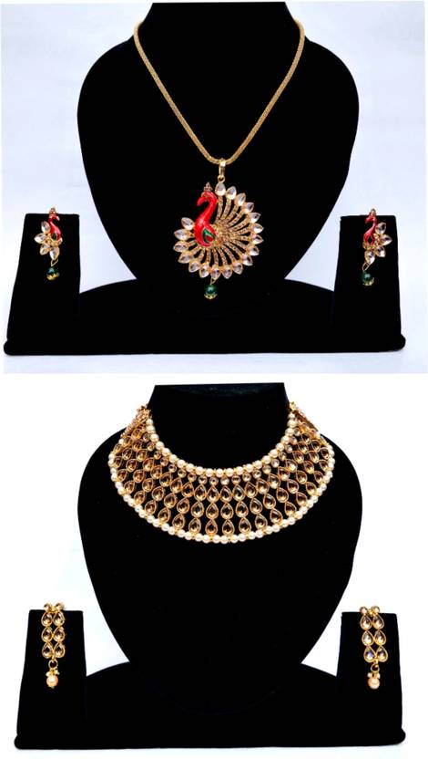 This Mannat Collection gold plated choker set and Mor design Chain set for women is made of alloy. women love jewellery; specially traditional jewellery adore a women. they wear it on different occasion. they have special importance on ring ceremony, wedding and festive time. they can also wear it on regular basics. make your moment memorable with this range. this jewel set features a unique one of a kind traditional embellish with antic finish