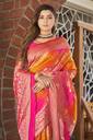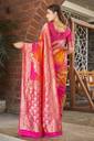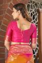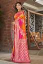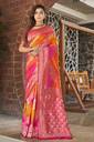 Manohari Traditional Pink & Yellow Banarasi Silk Jacquard Sari. This Beautiful traditional sari is elegantly decorated with gorgeous Woven pattern that gives a perfect look to the outfit. This sari is an ideal for Marriage functions and social gathering. Sari comes along with matching fabric un-stitched blouse piece. Sari Length : 5.5 mtr, Blouse Length: 0.8 mtr. Saree Fabric: Banarasi Silk , Blouse Fabric : Dhupion Silk.