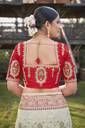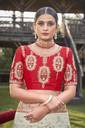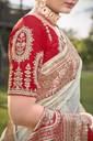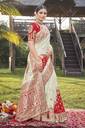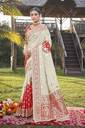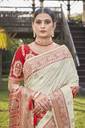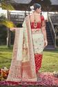 Manohari Traditional Off White & Red Banarasi Silk Jacquard Sari. This Beautiful traditional sari is elegantly decorated with gorgeous Woven pattern that gives a perfect look to the outfit. This sari is an ideal for Marriage functions and social gathering. Sari comes along with matching fabric un-stitched blouse piece. Sari Length : 5.5 mtr, Blouse Length: 0.8 mtr. Saree Fabric: Banarasi Silk , Blouse Fabric : Dhupion Silk.