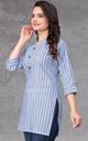 New Fancy Bollywood Design Trendy Women's Cotton Printed Mandarin Collar V-Neck Roll-Up Sleeve with Ties and Heavy Diamond Button Work Khadi Cotton Straight Striped Kurta Trendy Tunic (Blue, White)