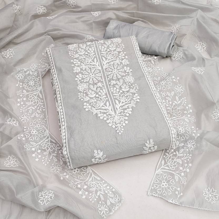 Women'S Grey Unstitched Embroidery Chanderi Cotton Dress Material Having Grey Color Unstitched Bottom Of Santoon Fabric And Grey Color Dupatta Of Chanderi Cotton Material With Amazing Grey Colour In Chanderi Cotton Santoon Fabric With Work Of Heavy Thread Embroidery And Fancy Border With Embroidered Dupatta|| Images Are For The Referance Purpose Only, Color Of The Actual Product May Little Vary From The Image Due To Screen Resolution